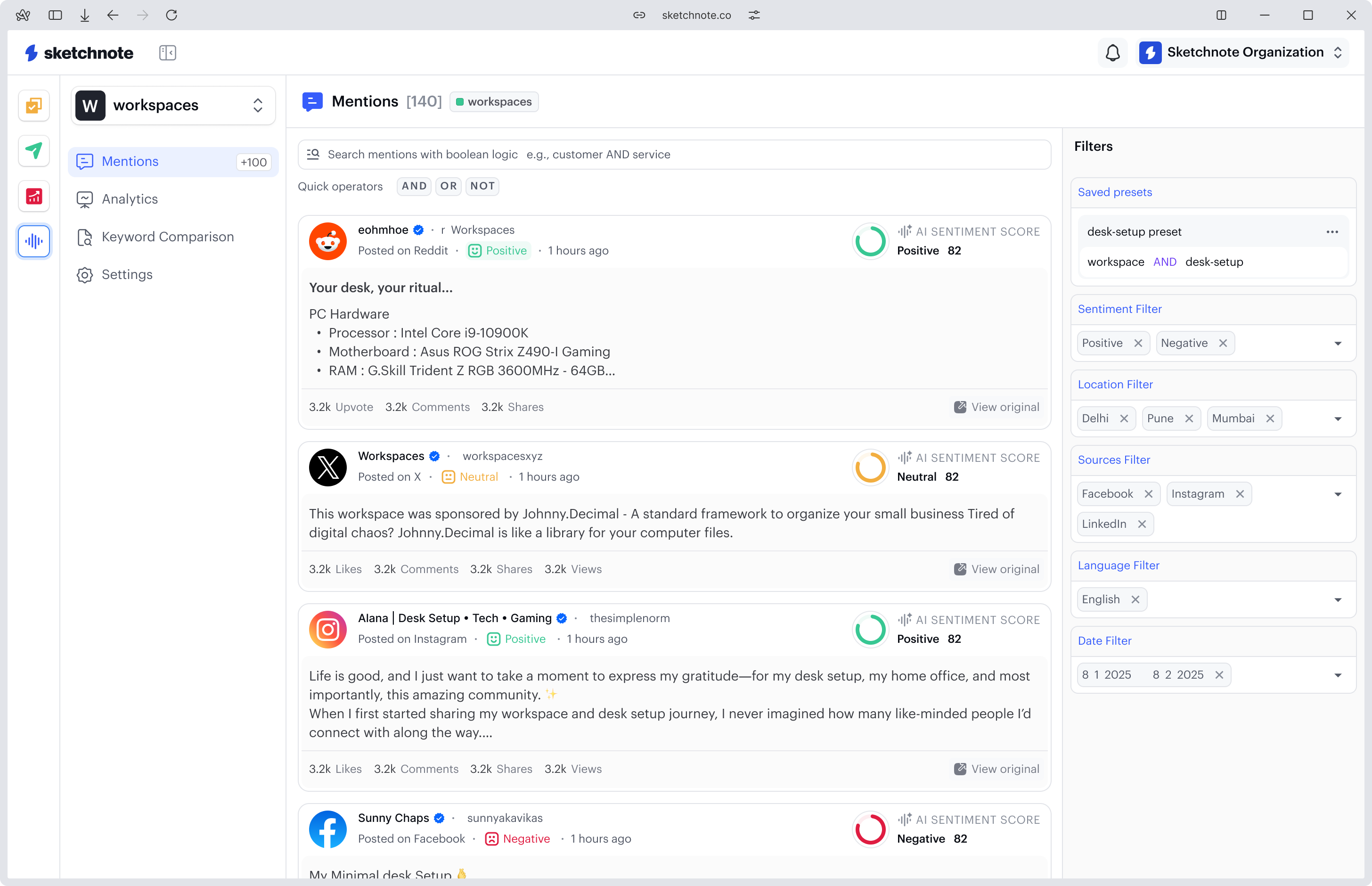How I designed Sketchnote's Social Listening product — a real-time brand monitoring platform that turns millions of raw online conversations into actionable signal for marketing teams and agencies.